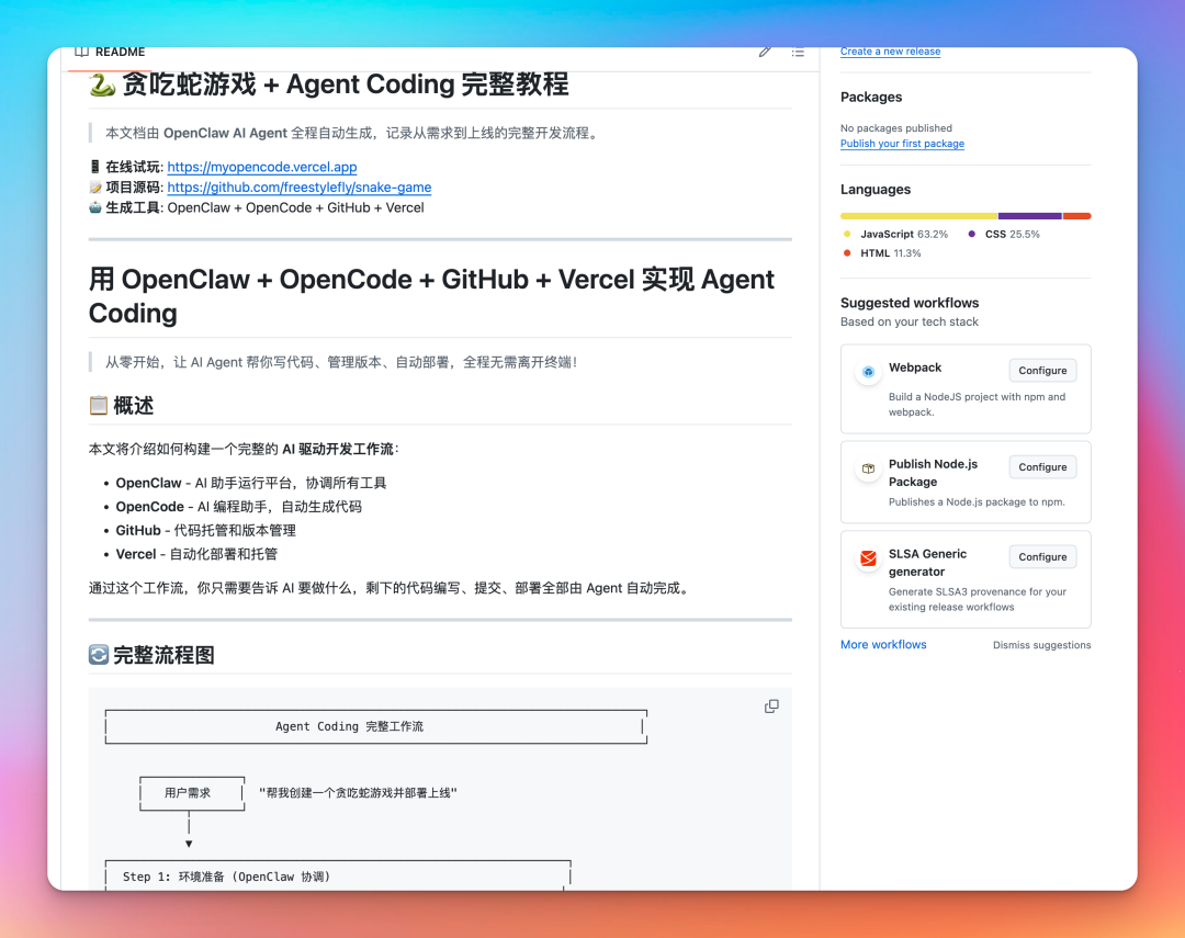 提示词;这个过程太棒了,我打算写一篇文章,你帮我直接根据你刚才的步骤,生成一篇文章,标题是:用 Openclaw+ OpenCode+GitHub+Vercel 实现 Agent Coding,最好是有流程图详细解释下这个步骤